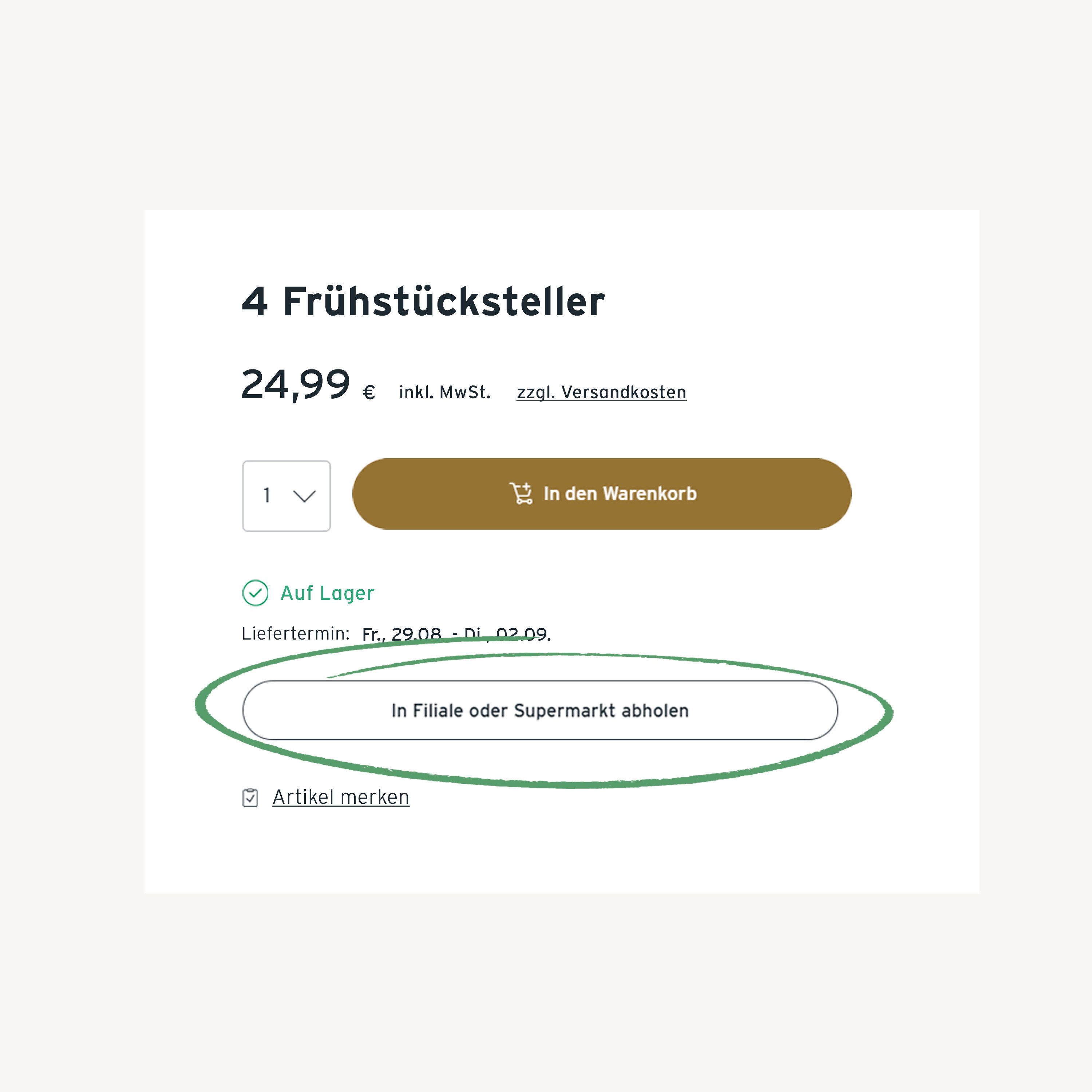 Ihr Wunschartikel ist in der Filiale nicht verfügbar? Mit Click & Collect bestellen Sie Ihre Artikel versandkostenfrei aus dem Onlinesortiment und können sie nach wenigen Tagen in Ihrer Wunschfiliale abholen und bezahlen. Das funktioniert auch, wenn Sie nicht eingeloggt sind und keine Wunschfiliale hinterlegt haben.