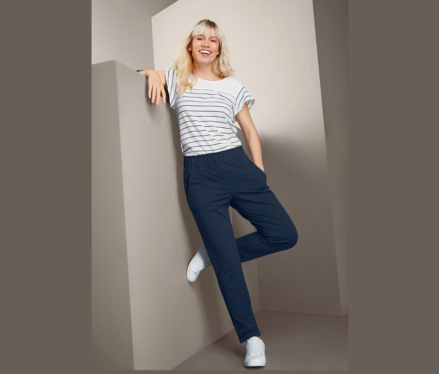 Die formbeständige Damenhose hat einen fixierten Saumaufschlag und der elastische Bund mit leichten Raffungen verhindert ein Einschnüren. Auf der Vorderseite ist sie mit zwei Eingrifftaschen versehen.