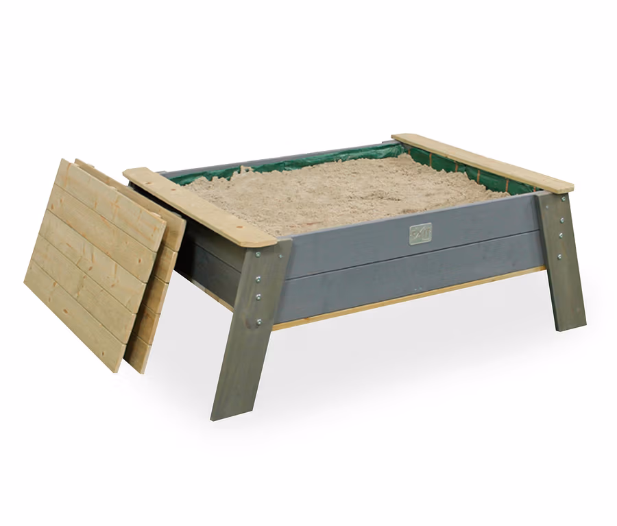 Der Sandtisch ist ideal für den heimischen Garten geeignet, sein Deckel hält den Sand dabei sauber und trocken. Er lässt sich einfach feucht abwischen und kann auch als Tischplatte zum Basteln oder Malen genutzt werden. Das Spielgerät ist aus nachhaltigem Holz gefertigt und im Inneren mit einem Vliestuch ausgeschlagen.