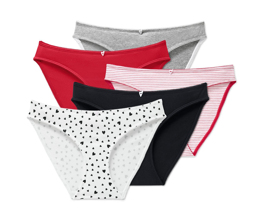 1x weiß mit schwarzem Herzchen-Print, 1x schwarz, 1x weiß mit roten Streifen, 1x rot, 1x grau meliert
