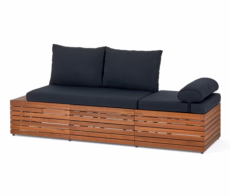 Der naturfarbene Korpus aus hochwertigem, FSC®-zertifiziertem Eukalyptusholz macht das Möbel ebenso UV- wie witterungsbeständig und sorgt in Kombination mit den schwarzen Auflagen für einen edlen, modernen Look. Die beiden fülligen Rückenkissen sind besonders bequem und das halbrunde Seitenkissen kann bei hochgeklappter Rückenlehne als Kopfkissen genutzt werden. Alle Kissenbezüge sind abziehbar und waschbar.