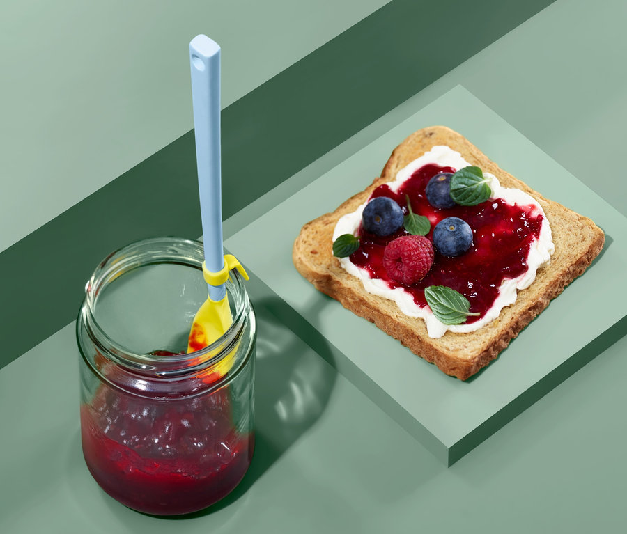 - Mit speziell geformter Laffe aus elastischem Silikon zum restlosen Leeren von z.B. Marmeladengläsern