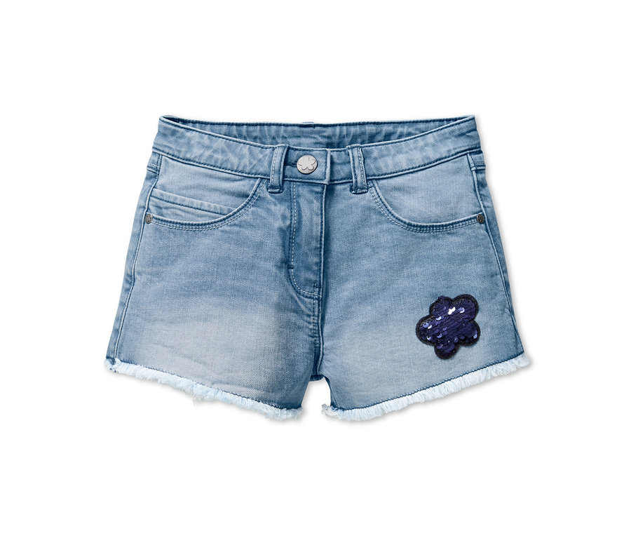 Mit diesen coolen Shorts macht der Sommer gleich noch mehr Spaß: Die Kinder-Jeans mit ausgefransten Säumen ist aus reiner, hautsympathischer Baumwolle gefertigt und im Bund sorgt ein innenliegender Verstellriegel für einen optimalen Sitz sowie eine perfekte Passform. Der eigentliche Hit ist aber die Blumen-Applikation aus Wendepailletten: Mit einem Wisch ändert sie die Farbe und verleiht der Hose einen neuen Look!