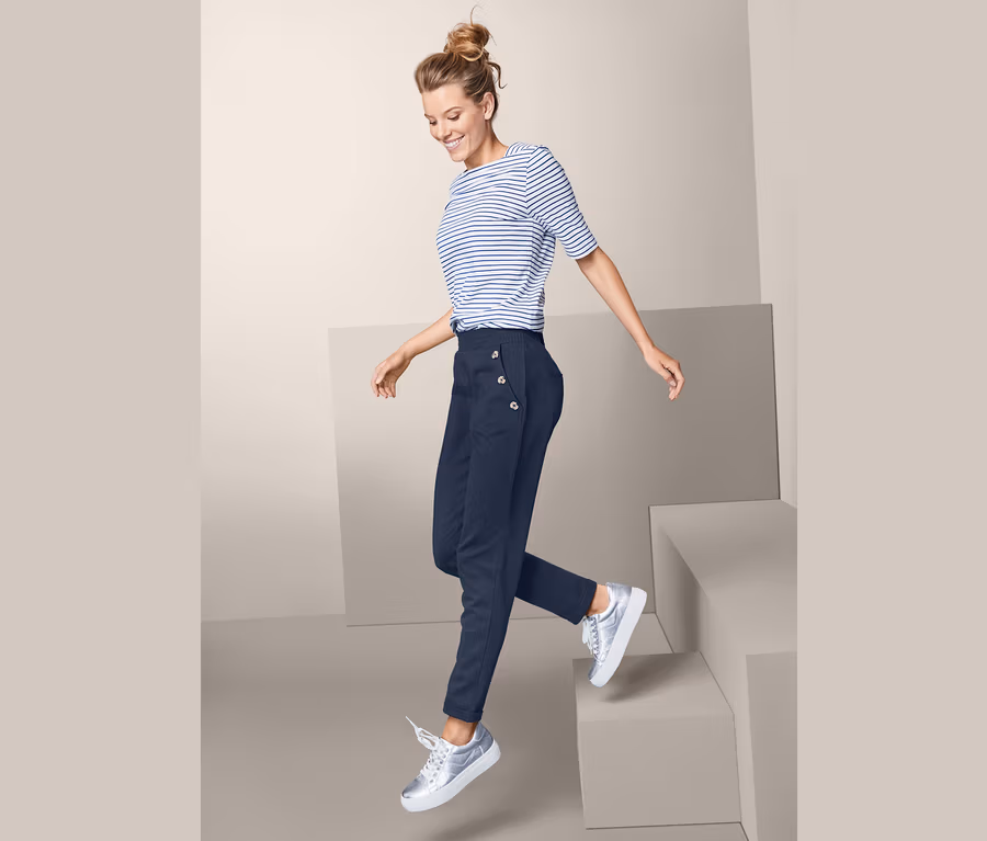 Die Hose ist mit fixiertem Saumumschlag und elastischem Bund gearbeitet, der für eine optimale Passform sorgt – ohne dabei einzuschnüren. Sie hat zwei Eingrifftaschen mit Zierknöpfen in hochwertiger Hornoptik und zwei Zier-Gesäßtaschen.
