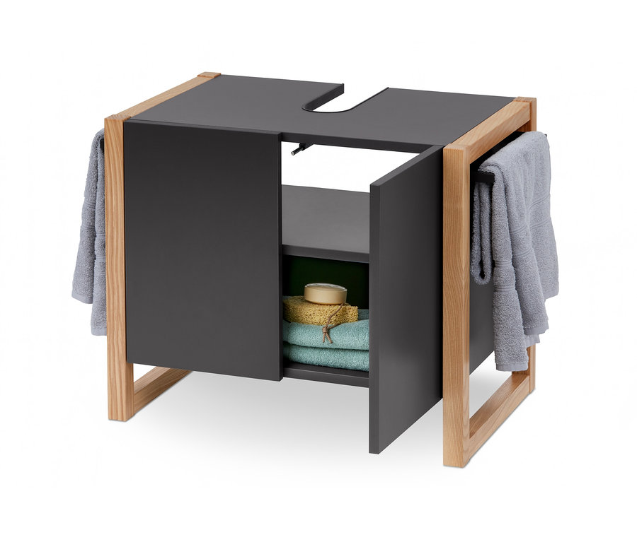 Das Badmöbel ist made in Germany und durch seine stoßfesten, strapazierfähigen Kunststoffkanten besonders langlebig. Das Gestell aus Eschen-Massivholz sorgt für einen sicheren Stand – und setzt gleichzeitig einen warmen, natürlichen Akzent. Der Siphonausschnitt ist angepasst an handelsübliche Waschbecken.