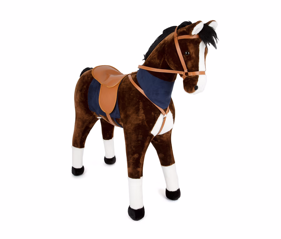- Inkl. abnehmbarem Sattel, Trense mit Zügeln und Halstuch