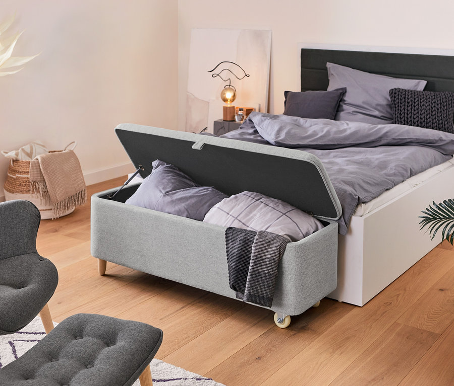 - Gepolsterte Stauraumbank mit Rollen zum flexiblen Verschieben