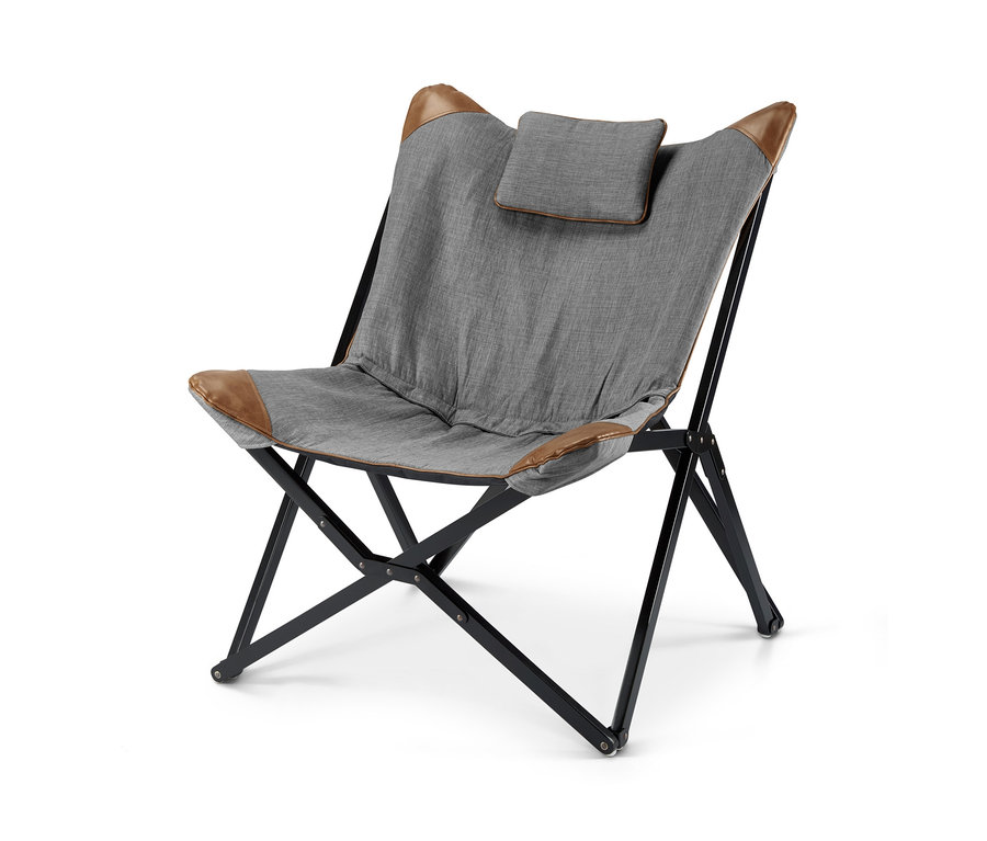 Dieser Relaxsessel hat das Zeug dazu, der neue Lieblingsplatz in den eigenen vier Wänden zu werden. Er ist ausgesprochen stylisch, bequem und lässt sich im Handumdrehen zusammenfalten. Das Sitzmöbel steht auf einem massiven Buchenholzgestell mit Metallscharnieren, das komplett matt schwarz lackiert ist und bis zu 100 Kilogramm trägt. Mit der Sitzfläche aus hochwertigem Strukturstoff lädt der Sessel zum Entspannen ein. An den Ecken ist sie mit Kunstleder-Applikationen verziert und auf der Rückenlehne sitzt ein weiches Kissen. Es kann mit einem Klettverschluss fixiert werden und hält – ebenso wie der Bezug der Sitzfläche – mindestens 20.000 Scheuertouren stand.