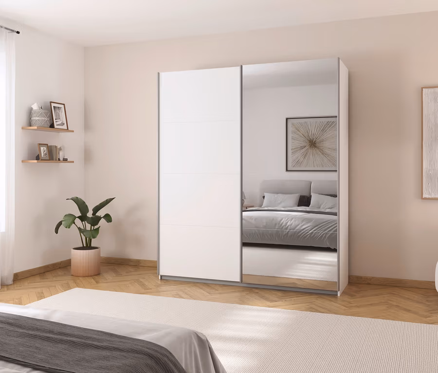 - Zeitloser Schwebetürenschrank in Weiß mit Spiegel und Alu-Griffleisten