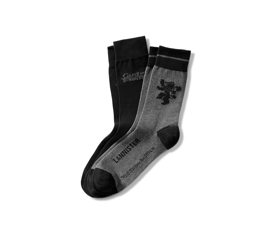 »Winter is coming« ... aber diese Socken können GoT-Fans das ganze Jahr über tragen. Die beiden Paare mit Game-of-Thrones-Einstrick sind in angenehm weicher Baumwoll-Mischqualität gefertigt, Elasthan sorgt für Formbeständigkeit, einen perfekten Sitz und hohen Tragekomfort. Die Socken haben verstärkte Spitzen und Fersen, sind mit extraflachen Zehennähten gearbeitet und ihre elastischen Bündchen verhindern, dass sie rutschen.