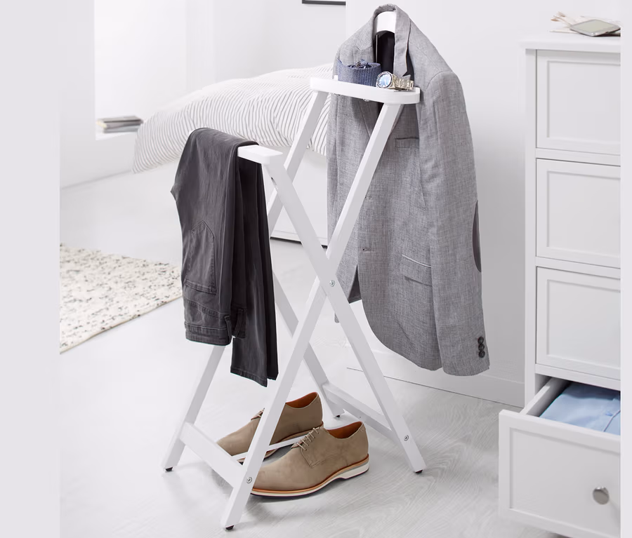 Mit einem Kleiderbügel, einem Hosenbügel und der typischen Ablagefläche für Schmuck und andere Accessoires bietet er jede Menge Platz. Das Gestell ist aus FSC®-zertifiziertem Eukalyptusholz gefertigt und hat ein Textilband als Öffnungsbegrenzung. Wenn man das Möbel nicht braucht, lässt es sich platzsparend zusammenklappen und verstauen – aber dafür ist es eigentlich viel zu nützlich.