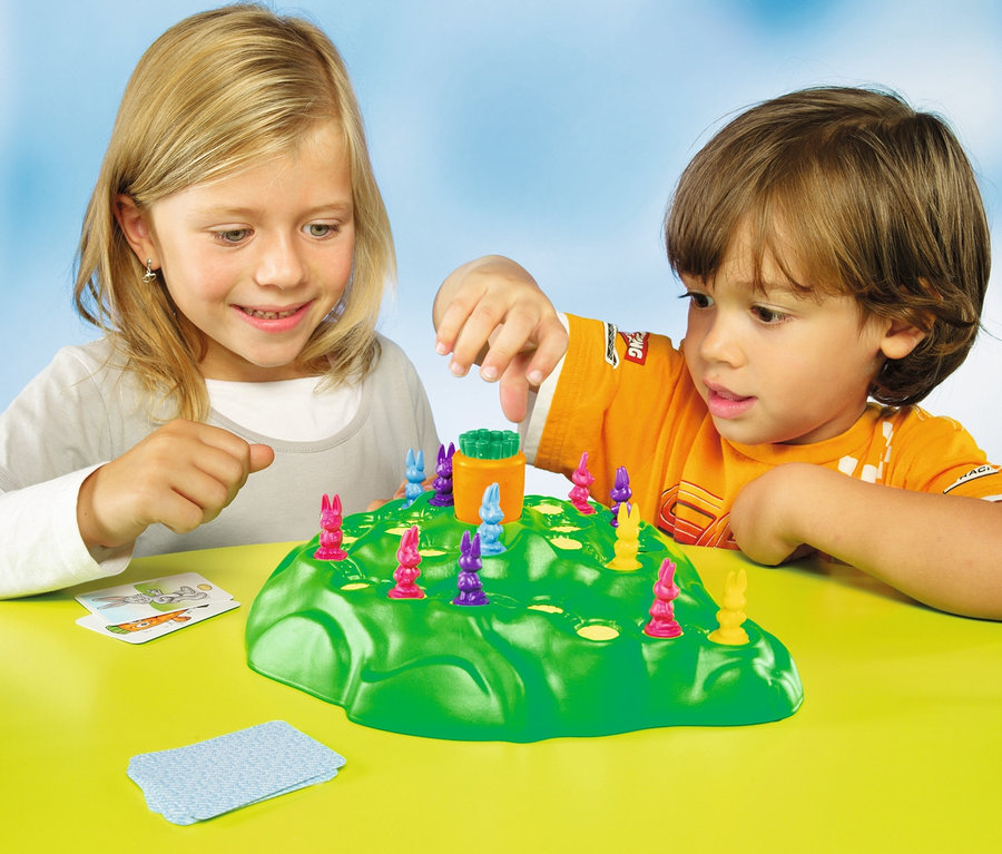 »Lotti Karotti« ist das lustige Wettlaufspiel für Kinder, bei dem es auf dem Weg zum Ziel immer wieder böse Überraschungen geben kann. Die bunten Hasen versuchen, auf dem Hügel die Karotte zu erreichen. Die Kinder ziehen Karten, auf denen angezeigt wird, wie viele Felder der Hase vorrücken darf. Wer aber die Karottenkarte zieht, darf an der Karotte drehen und es öffnen sich Löcher auf dem Weg zum Ziel. Die Hasen, die Pech haben, fallen runter. Wer es schafft, sich am Ende auf die Karotte zu setzen, gewinnt – und schon kann es für die frechen Hasen von vorne losgehen. Das Spiel ist geeignet für zwei bis vier Kinder ab vier Jahren und dauert etwa 20 Minuten.