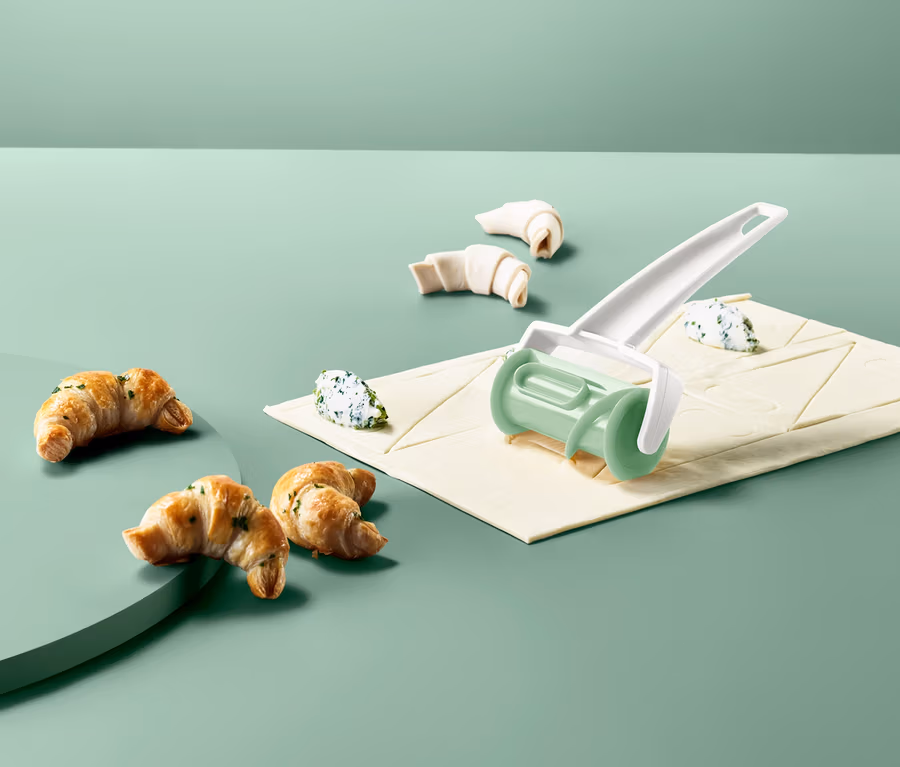 - Über den gekühlten Teig rollen, ggf. eine Füllung in die Markierung geben, die ausgestochenen Dreiecke zu Croissants rollen und backen