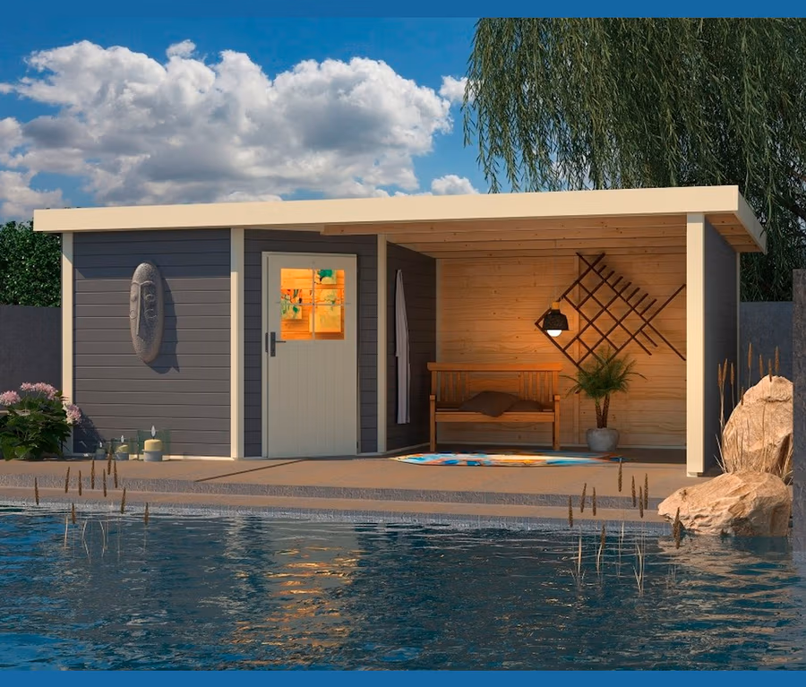 - B x H x T inkl. Anbaudach ca. 536 x 222 x 244 cm