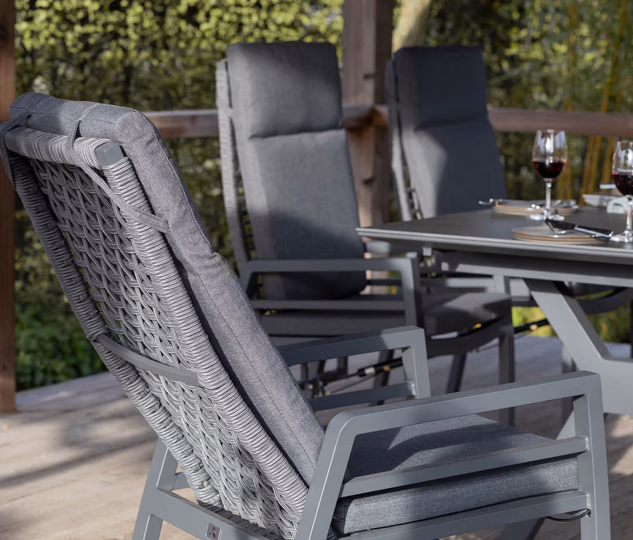 - 7-teiliges Dining-Set – bestehend aus einem Ausziehtisch und 6 verstellbaren Hochlehnern inkl. Kissenauflagen