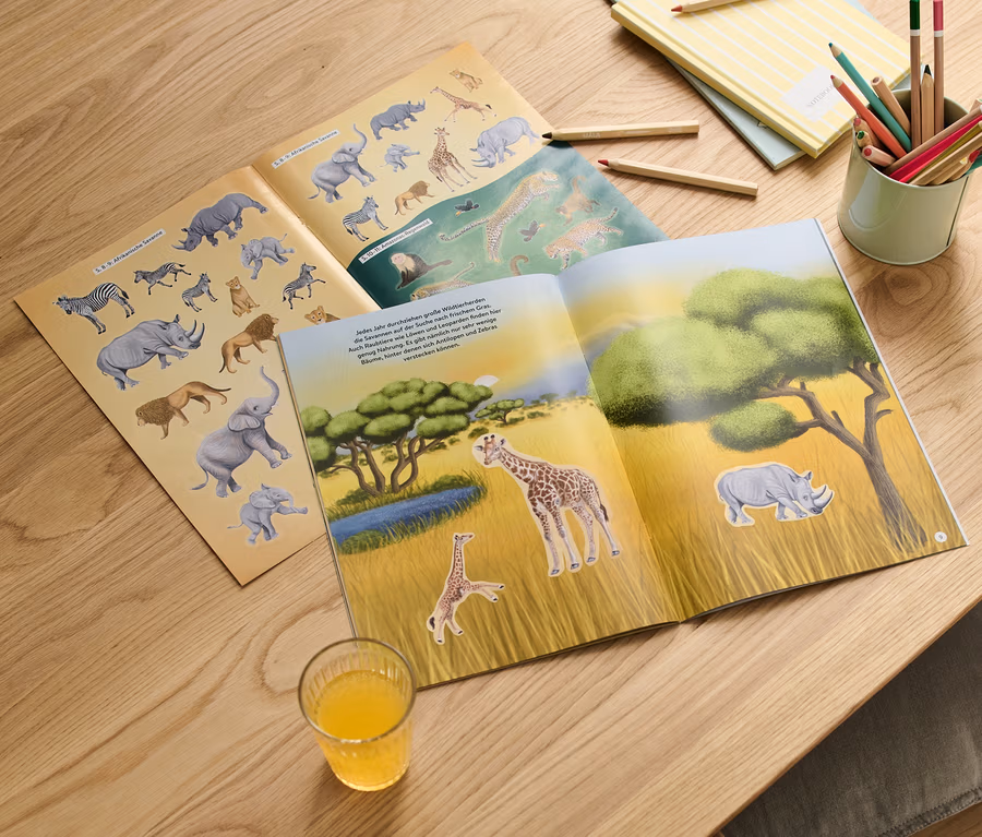 - Mit den Stickern und den liebevoll illustrierten Hintergrundseiten lässt sich ein eigenes Bilderbuch gestalten