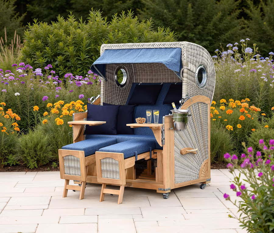 - Aufgebauter Teak-Strandkorb in komfortabler Ausstattung für 2 Person inkl. Rollen, Schutzhaube und Champagnerkühler