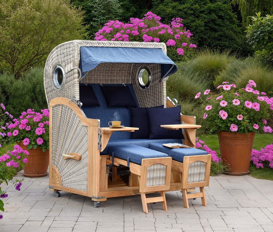 Inkl. Kissenausstattung, Markise, 2 Fußstützen, 2 Cocktailschwenktischen, 2 Bullaugen, 2 Transportgriffen, 4 Doppellenkrollen, Premium-Schutzhaube und Pflegehinweisen