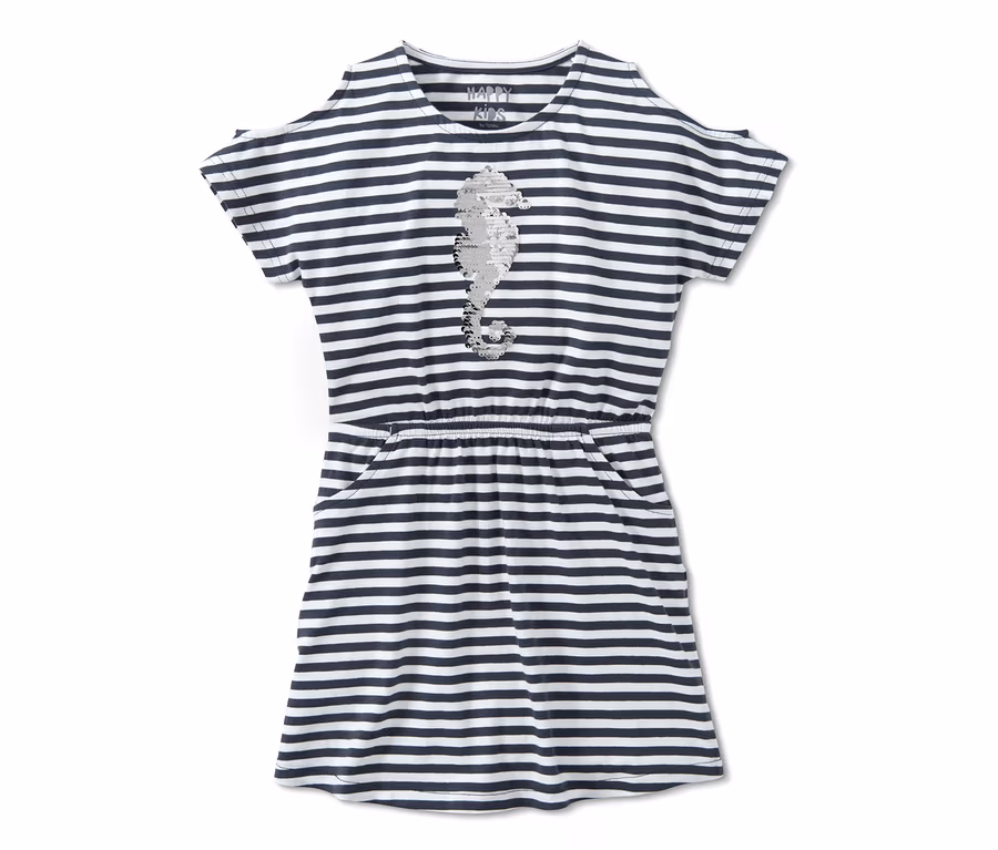 Cooler Effekt, cooles Kleid: Dieses Jerseykleid ist mit seinen Wendepailletten ein echtes Highlight für die Kids. Die vorne aufgesetzten Pailletten wechseln beim Darüberstreichen ihre Farbe und verleihen dem Kleidchen zwei unterschiedliche Looks.