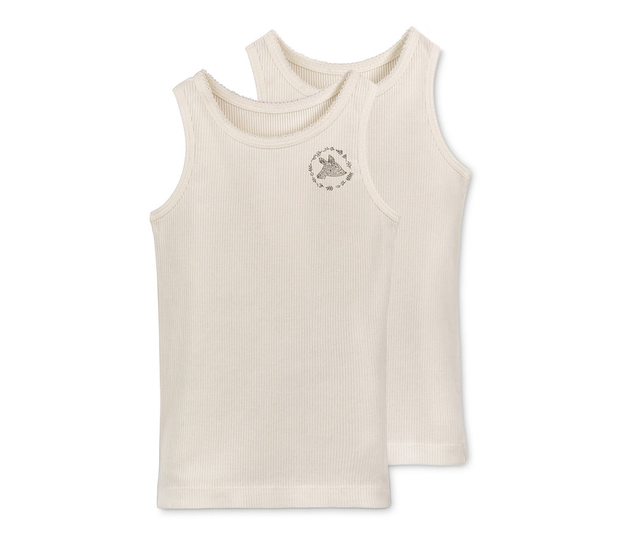 Feinripp-Unterhemden gehören zu den beliebtesten Klassikern der Unterwäsche – und das natürlich auch bei Kindern und Kleinkindern. Diese beiden ärmellosen Hemdchen sind in wunderbar weicher Baumwoll-Stretch-Qualität gefertigt und liegen dadurch bei jeder Bewegung angenehm auf der Haut. Sie sind gerade und schmal geschnitten, das eingearbeitete Elasthan macht sie formbeständig und sorgt für einen perfekten Sitz sowie zusätzlichen Tragekomfort. Die Unterhemden sind im klassischen Cremeweiß gehalten und haben einen liebevoll gestalteten Motivprint auf der Brust.