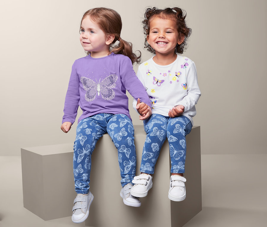 Schmetterlinge kommen bei Kindern immer gut an – und hier kommen sie direkt im Doppelpack: Die beiden Langarmshirts sind ein weicher Single-Jersey-Qualität mit einem hohen Anteil an Bio-Baumwolle gefertigt und liegen auch beim Toben und Spielen jederzeit besonders angenehm auf der Haut.