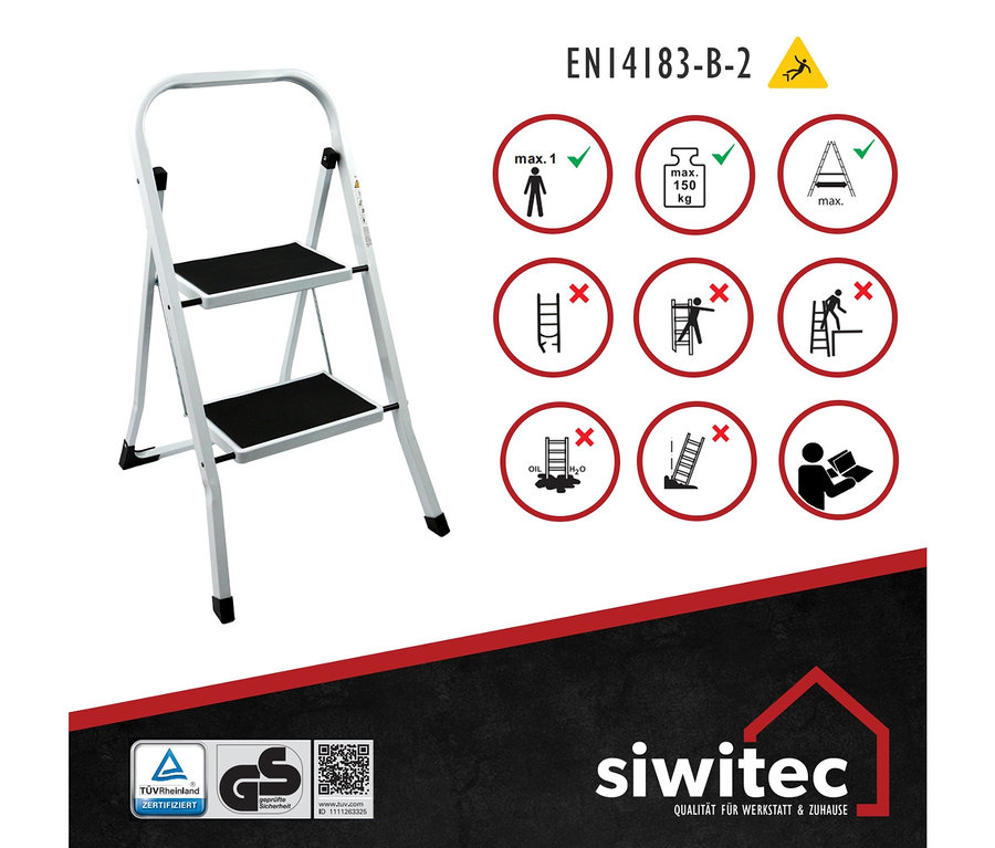 - Bei Benutzung eines Trittes keine Ausrüstung rauf- oder runtertragen, die schwer oder unhandlich ist.