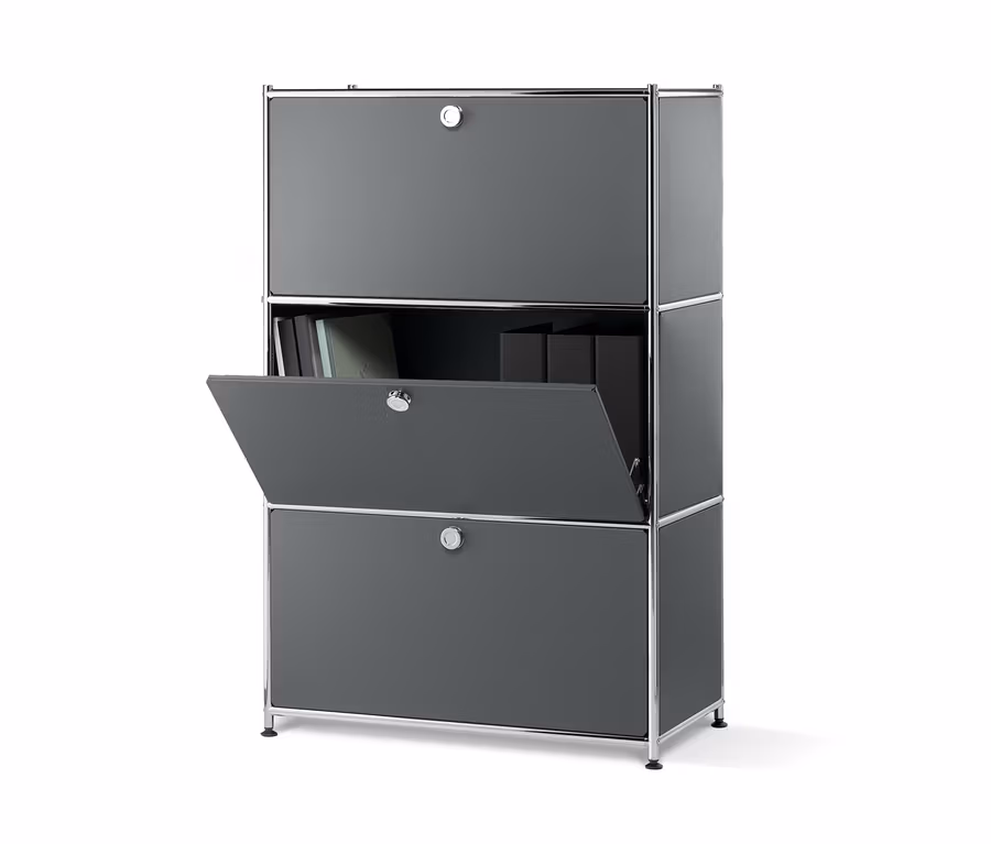 Gutes Design ist vor allem zeitlos – das gilt auch bei den Stücken aus unserer stylischen Metall-Möbel-Serie, wie diesem Metallregal mit drei sichtgeschützten Klappenfächern.