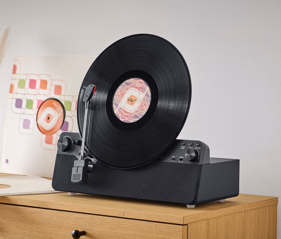 Vertikaler Plattenspieler mit integrierten Lautsprechern