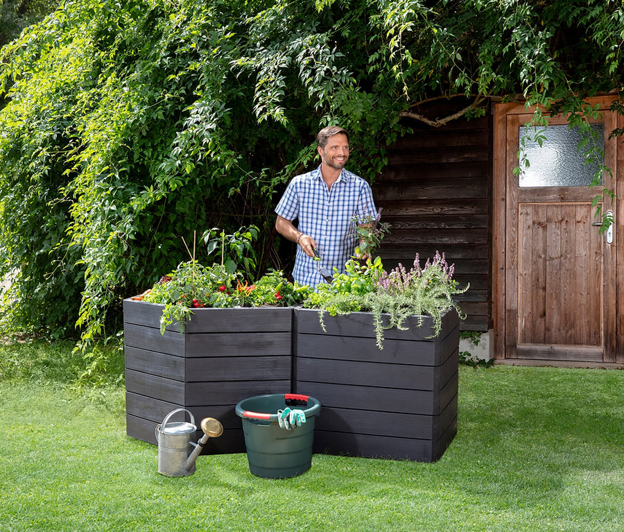 - Modular gestalten in vielen Variationen – System besteht aus Ergo Hochbeet L (6-Eck-Form), Ergo Quadro M Hochbeet und Flora Wassersparsystem