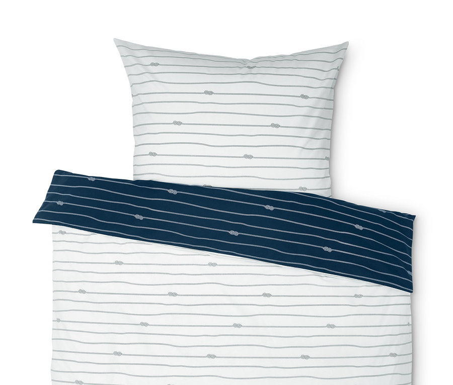 Maritimes Design kommt mit dieser Perkal-Wendebettwäsche gleich zweimal ins Schlafzimmer: einmal in klassischem Dunkelblau und einmal in edlem Weiß, jeweils mit einem schönen Knotenprint. Die feine, dicht gewebte Qualität des Perkals punktet dazu mit besten Materialeigenschaften. So ist der Stoff besonders weich, leicht und glatt, Kissen- und Bettbezug sind saugfähig und wirken temperaturausgleichend. Die der Umwelt zuliebe aus reiner Bio-Baumwolle gefertigte Bettwäsche ist dank Reißverschluss einfach und schnell zu beziehen.