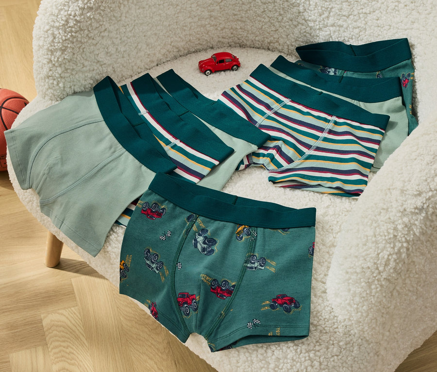 - 2x dunkelgrün mit Truck-Alloverprint, 2x mehrfarbig gestreift, 3x salbei