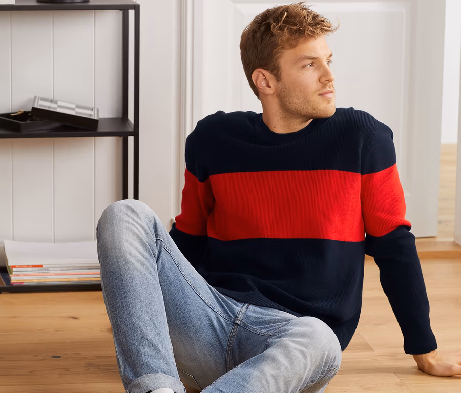 - Elastische Rippstrickbündchen an Ausschnitt, Ärmeln und Saum