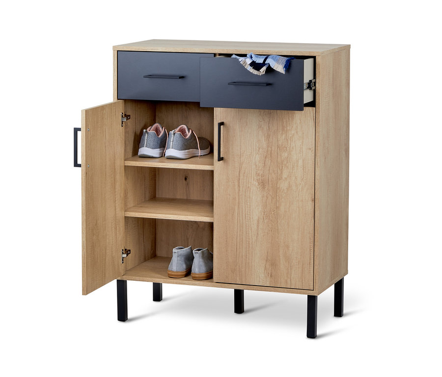 In diesem stylischen Schuhschrank verschwinden Schuhe und Putzutensilien auf besonders elegante Art und Weise. Der Schrank ist im angesagten Industrial Stle designt und setzt mit seiner Kombination aus elegantem Anthrazit und warmem, naturfarbenem Eichendekor im Flur oder im Ankleidezimmer einen modernen und edlen Akzent.