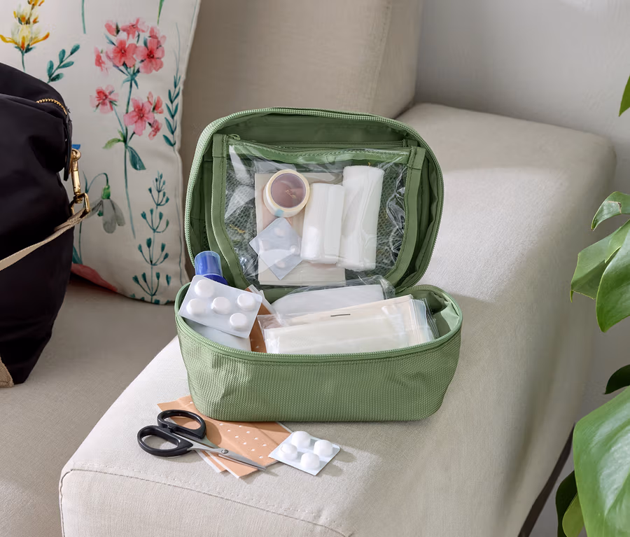 - Geordnete Aufbewahrung für Medikamente und Erste-Hilfe-Material