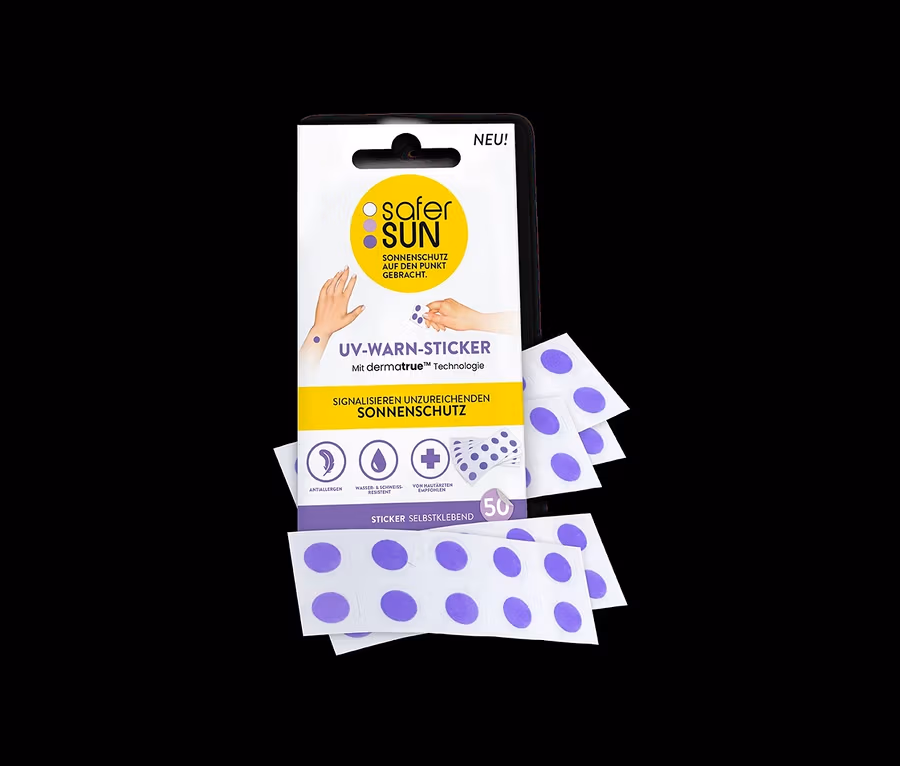 Der eine muss also früher nachlegen, die andere später – und mit diesen UV-Warnstickern wird man rechtzeitig darauf hingewiesen. Die Anwendung ist denkbar einfach und ohne weitere Hilfsmittel möglich: einfach auf die Haut kleben und Sonnenschutz auftragen – fertig.