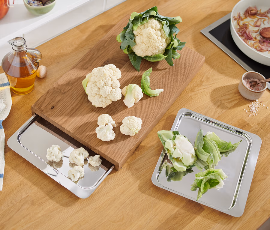 • Einfache Reinigung – Schneidebrett per Hand abwischbar, Auffangschalen spülmaschinengeeignet
