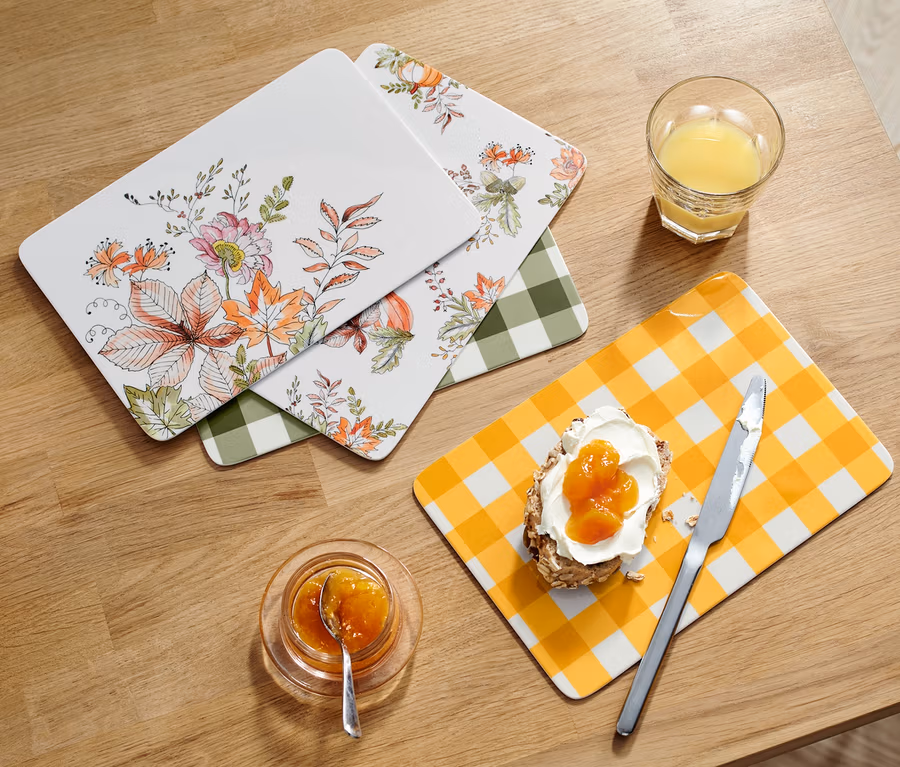 - 1x gelb kariert, 1x dunkelgrün kariert, 1x weiß mit mehrfarbigem floralem Alloverprint, 1x weiß mit mehrfarbigem, floralem Print