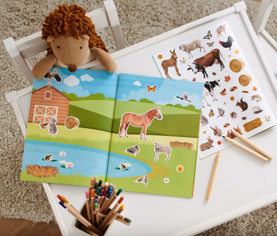 - Dieses Stickerbuch bietet jede Menge Raum, eigene Bauernhof-Welten zu erschaffen und der Fantasie freien Lauf zu lassen. Ein schönes Heft, mit dem sich schon Kinder ab 3 Jahren selbstständig, ganz ohne Hilfe von Erwachsenen beschäftigen können – ob unterwegs oder im Kinderzimmer.