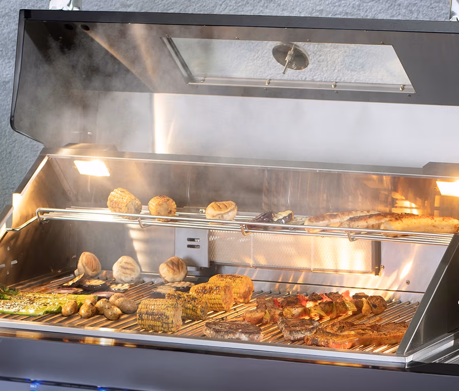 - Grill mit Edelstahl-Haube mit integriertem Thermometer, Sichtfenster und eingebauter Beleuchtung