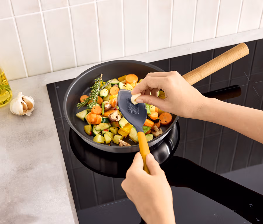 - Bei der Verwendung von Öl kann die Temperatur von 200 °C unter Umständen überschritten werden. Lassen Sie den Pfannenwender daher nie in oder auf dem Rand von heißen Pfannen oder Töpfen liegen.