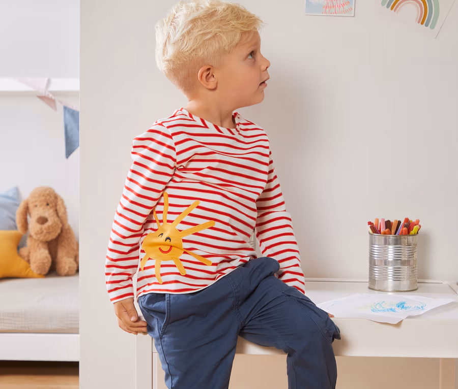 - 1x mittelblau mit weißem Wolken-Print, 1x rot-weiß gestreift mit gelbem Sonnen-Print