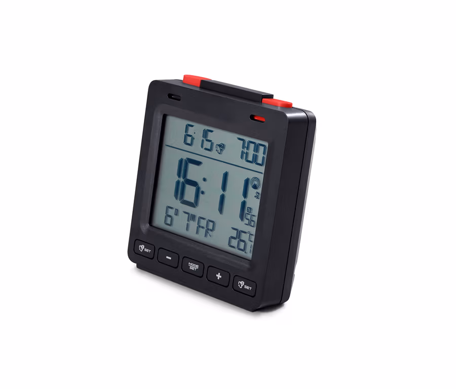 Kompakt, vielseitig und zuverlässig: Der digitale Funkwecker stellt sicher, dass man pünktlich wach wird, ohne allzu abrupt aus dem Schlaf gerissen zu werden. Sein Crescendo-Alarm wird langsam lauter und die Snooze-Taste sorgt bei Bedarf wieder für Ruhe. Wenn auch nur kurz. Man kann zwei verschiedene Weckzeiten einstellen, die sich beide auch separat per Knopfdruck ein- und ausschalten lassen.