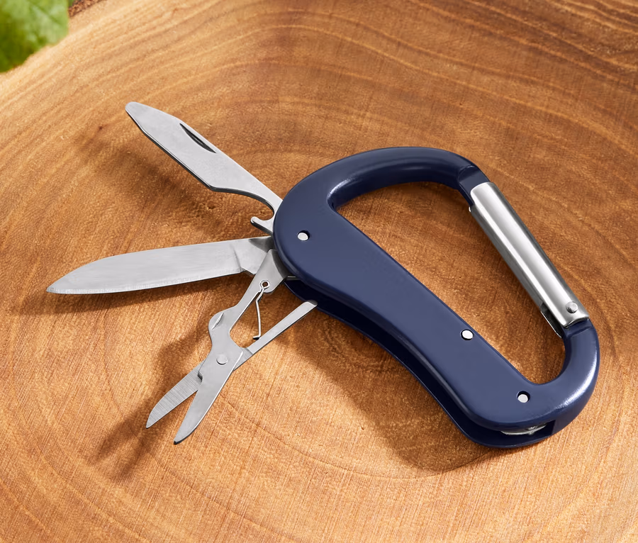 - 5 Funktionen: Karabiner, Schere, Nagelfeile, Flaschenöffner und Messer