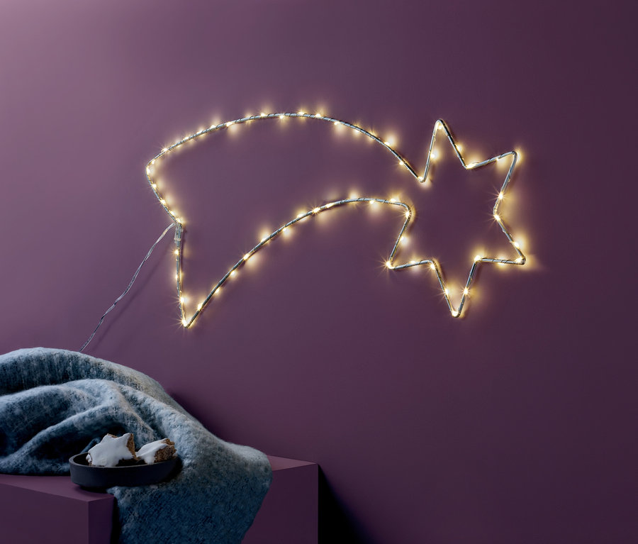 Die Lichterkette war gestern – jetzt gibt es die LEDs in weihnachtlicher Sternschnuppenform! Die Silhouette besteht aus einem stabilen Metallrahmen, der silberfarben lackiert ist. 60 Micro-LEDs mit warmweißem Licht bilden die Form einer Sternschnuppe. Sie sorgt für angenehmes Licht und einen leuchtenden Hingucker im Innenbereich – und das nicht nur an Weihnachten. Die eingebaute Timerfunktion schaltet die LED-Sternschnuppe nach ca. sechs Stunden automatisch ab und nach ca. 18 Stunden wieder ein. Ein Netzadapter ist bereits enthalten.