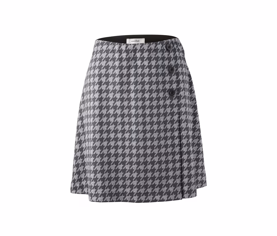 Ganz schön schick – und genauso bequem: Der bequeme Jerseyrock in modischer Wickeloptik liegt mit seiner weichen Qualität angenehm leicht am Körper, Elasthan sorgt dabei für Formbeständigkeit sowie hohen Tragekomfort und mit seinem elastischen Bund sitzt er einfach perfekt auf der Hüfte. Das klassische Hahnentritt-Dessin und drei dekorative Knöpfe verleihen dem Rock einen eleganten Look und die leichte A-Linie betont die femnine Silhouette.