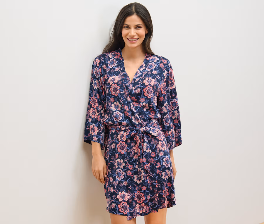 • Dieser Morgenmantel beinhaltet Fasern aus nachhaltigem Holz.