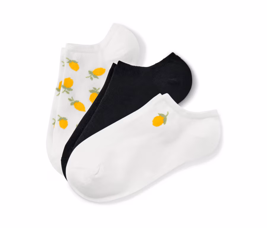 - 1x weiß mit platzierter Zitronen-Stickerei, 1x weiß mit ganzflächigem Zitronen-Einstrick, 1x schwarz