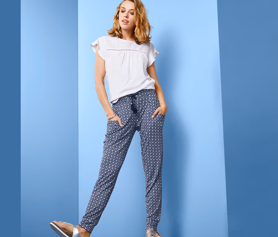 Die Damenhose hat einen breiten, elastischen Taillenbund mit eingelegten Falten und ein Bindeband mit dekorativen Quasten, die von silberglänzendem Garn durchzogen sind. Sie hat zwei Eingrifftaschen und angesetzte Bündchen an den Beinabschlüssen, die ihr eine lässige Passform verleihen. Mit ihrem maritimen Alloverprint ist die Hose so die perfekte Basis für jedes Freizeit-Outfit.