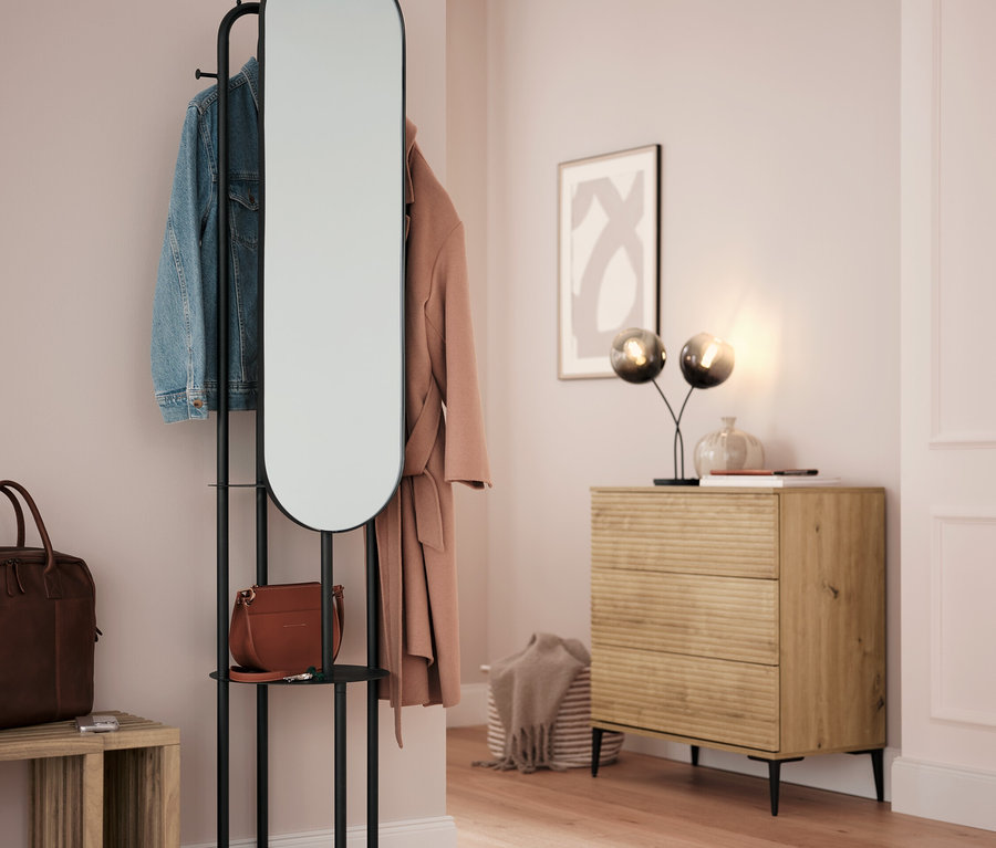 Spiegel im Metallrahmen, Garderobenstange mit Stoppern, 2 Haken, 2 Ablagefläche hinter dem Spiegel, 1 Bodenplatte im Floating-Look