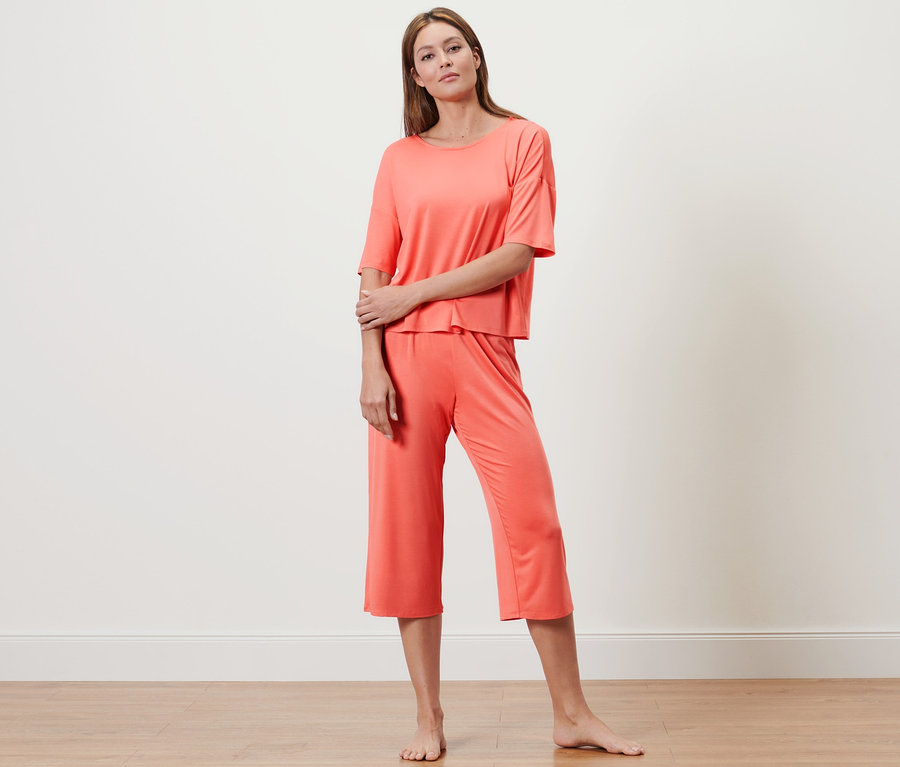 - Dieser Pyjama beinhaltet Fasern aus nachhaltigem Holz.